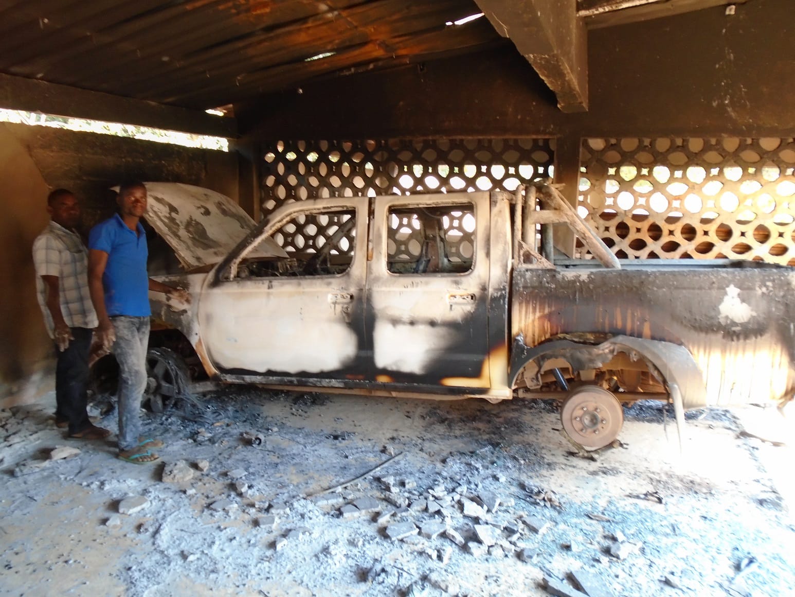 Mozambique / Coche incendiado en la misión de Chipene tras el ataque. Visita del obispo Alberto Vera Aréjula tras el ataque en Nacala en septiembre de 2022.